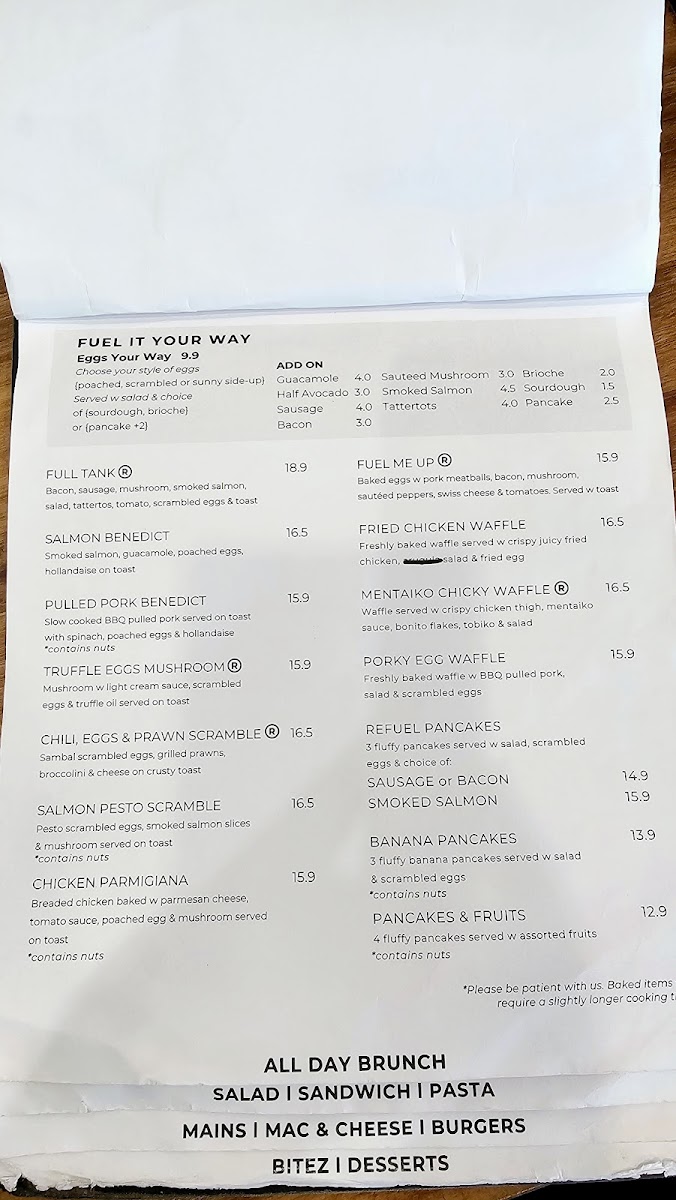 Beverages cover a variety of coffee and tea drinks, including signature flat whites, iced lattes like the Iced Caramel Latte, and a selection of iced teas such as Iced Lychee Tea, Fuel Iced Tea with citrus notes, and Iced Strawberry Mint Tea. English Breakfast tea is also available.
