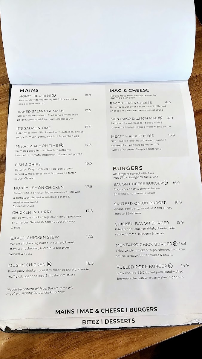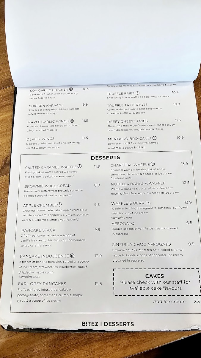 Bitez includes small plates and appetizers such as Truffle Fries and Truffle Tattertots topped with parmesan cheese, Soy Garlic Chicken with a mildly spicy Korean dressing, Mushroom Soup served with toasted sourdough, and Maple Garlic Wings.